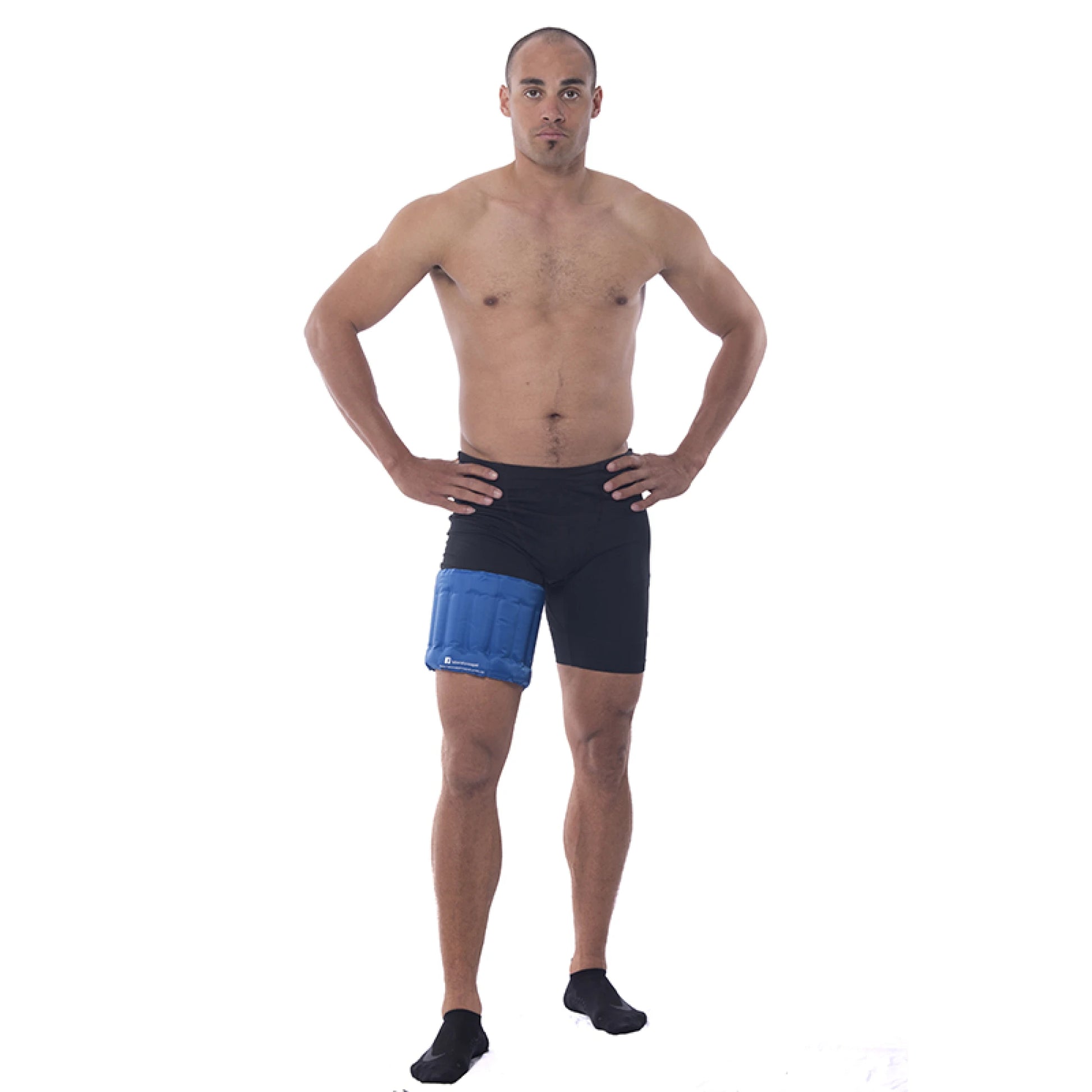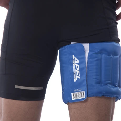 Banda con gel, modelo Muslo, que posee la propiedad de no congelar, de acción gradual para tratamiento mediante crioterapia y termoterapia.