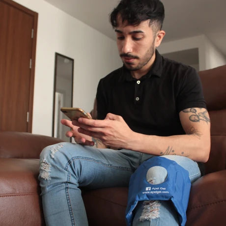 Banda con gel, modelo Rodilla, que posee la propiedad de no congelar, de acción gradual para tratamiento mediante crioterapia y termoterapia.